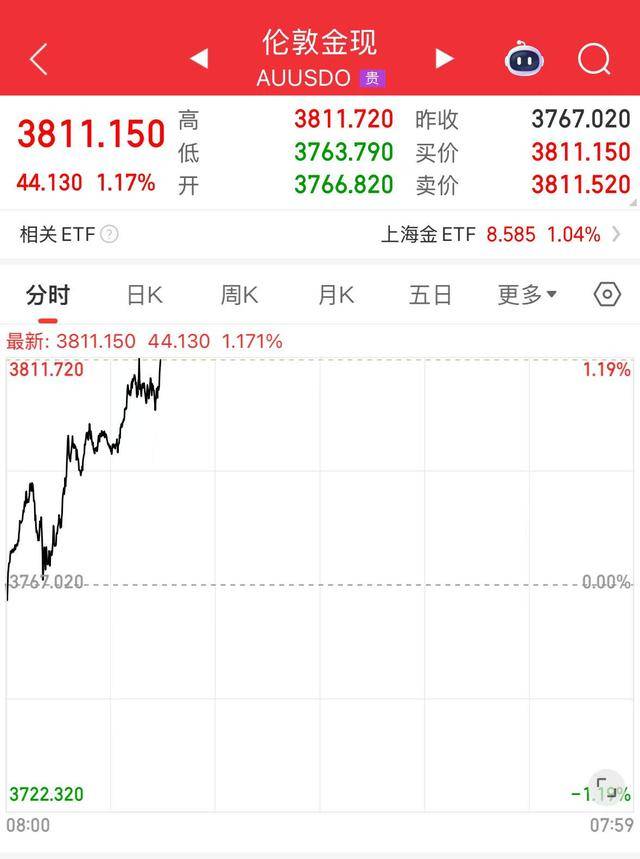 据同花顺数据,截至发稿,现货黄金报3811.150美元/盎司,日内涨超1%,年内累计上涨超40%。