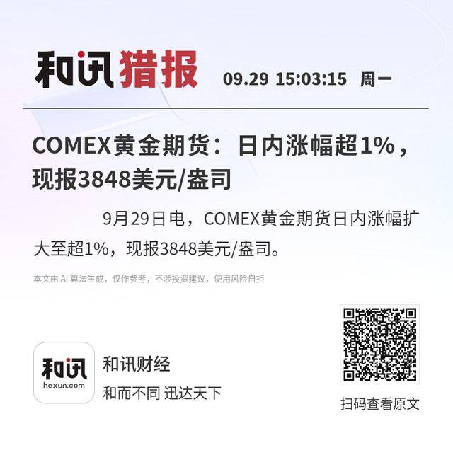 9月29日电,COMEX黄金期货日内涨幅扩大至超1%,现报3848美元/盎司。