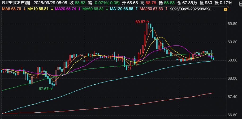 布油小幅下挫,下跌0.03%至每桶68.53美元。