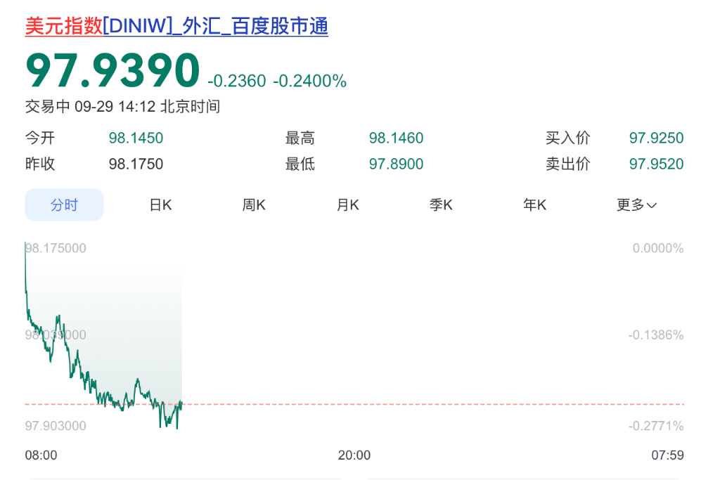 美元指数受美国政府可能关门的影响,下跌近0.26%,报97.94%。政府关门可能导致关键就业数据推迟公布,并给美联储的货币政策路径蒙上阴影”。周一晚些时候,特朗普将与国会民主党和共和党高层领导人讨论延长政府拨款事宜。如果未能达成协议,政府将从周三开始停摆。
