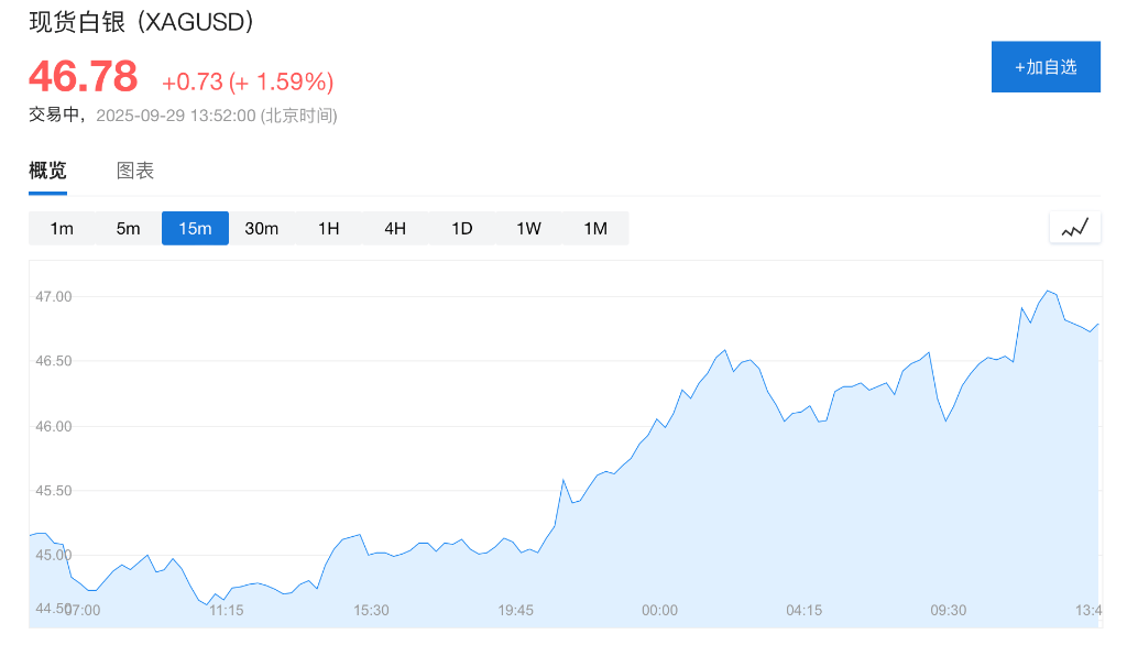 现货白银上涨 1.59% 至每盎司 46.78美元。