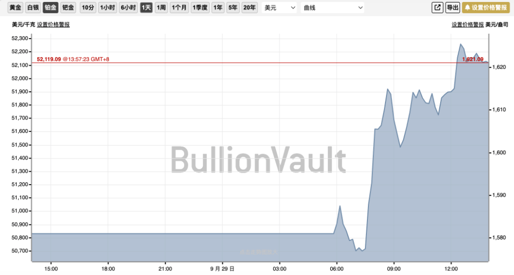 美元指数下跌近0.26%,报97.94。金属商品走强,现货黄金触及每盎司3805.88美元的历史新高,现货白银大涨超2%至46美元/盎司,创十四年新高,铂金、钯金均上涨,布油小幅下挫,下跌0.03%。