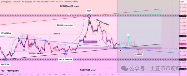 当前,0.229被视为狗狗币的关键支撑位。该位置在周末被成功守住,不仅确认了短期支撑的有效性,也暗示着后续上涨动能可能比9月初更为强劲。