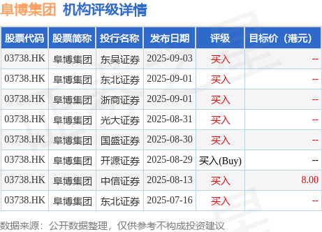 截至2025年9月29日收盘,阜博集团(03738.HK)报收于5.54港元,上涨1.47%,成交量3681.18万股,成交额2.03亿港元。投行对该股的评级以买入为主,近90天内共有7家投行给出买入评级,近90天的目标均价为8港元。东吴证券最新一份研报给予阜博集团买入评级。