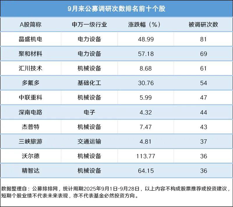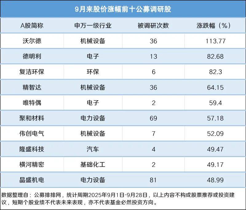 公募基金调研股9月以来也交出了不错的成绩。截至9月28日,被南方基金、平安基金、富国基金等在内的30家公募机构扎堆调研的沃尔德,9月以来涨幅领跑,上涨113.77%。德明利、精智达、唯特偶等公募9月调研股也涨幅较大。