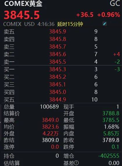 期货方面,COMEX黄金期货也迎来大涨。截至记者发稿,COMEX黄金期货日内涨0.96%,报3845.5美元/盎司,盘中一度触及3849美元/盎司。