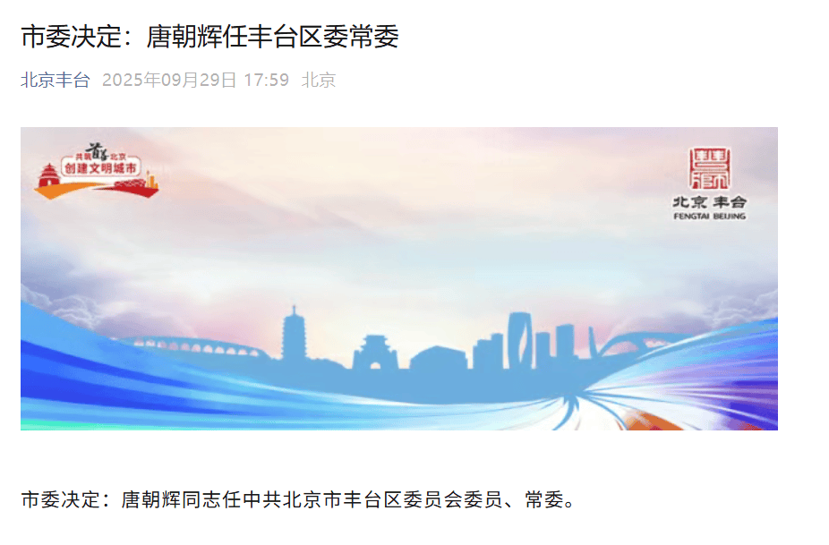 新京报讯 据北京丰台微信公众号消息,北京市委决定:唐朝辉同志任中共北京市丰台区委员会委员、常委。