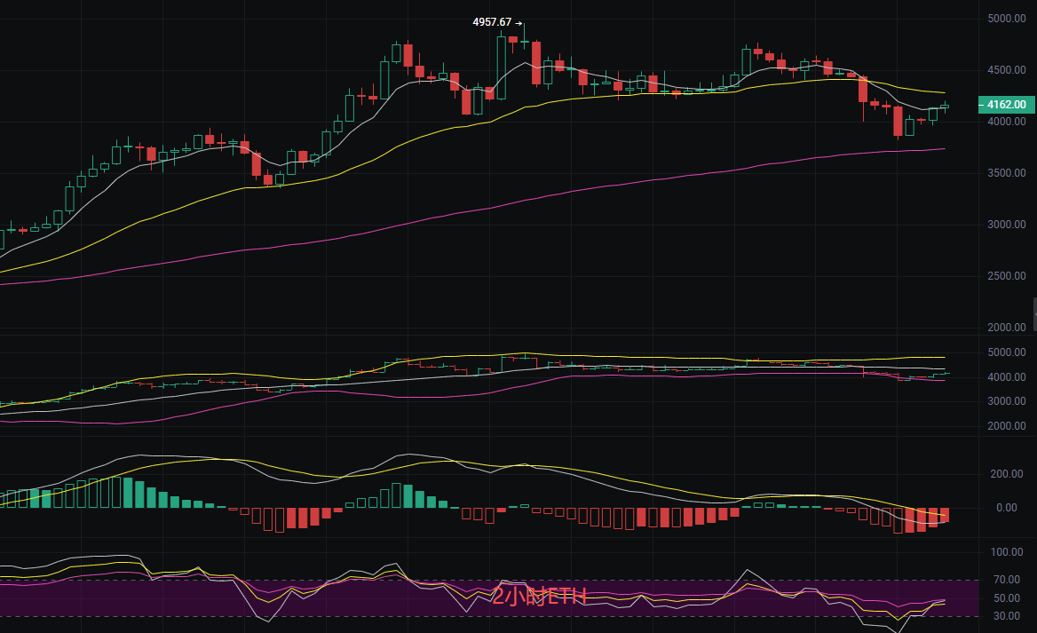 发稿前以太坊现价4165,丽盈观察目前以太震荡格局技术面信号偏向看涨,但成交量不足和超买指标提示短期内需警惕回调风险。从技术面来看,均线多头排列和黄金交叉明确了趋势偏向上行的潜力,同时看涨吞没形态进一步强化了反弹预期,日线】从低点3966逐步反弹至4168,形成连续阳线,呈现短期上涨趋势,2小时K线在4100附近出现明显支撑后持续拉升,目前高位震荡,最高触及4205,MACD日线金叉向上2小时处于多头状态,EMA短期、中期均线呈现多头排列,盘口由空转多,思路上顺势多为主