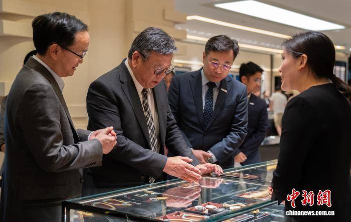9月29日,香港特区政府商务及经济发展局局长丘应桦(左二)、投资署助理署长刘智元(左三)参观“老铺黄金”位于国际金融中心的新店。 (香港特区政府新闻处供图)