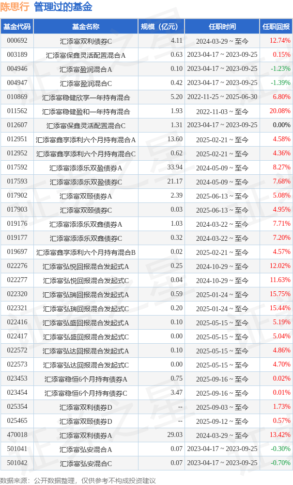 陈思行女士:中国国籍,复旦大学金融学硕士。2011年7月至2012年9月任方正证券投资经理;2012年10月至2016年7月任光大证券高级投资经理;2016年9月至2019年4月任银华基金投资经理;2019年5月至2021年12月任平安养老投资经理;2021年12月至2022年7月任国寿养老高级投资经理。2022年7月加入汇添富基金。2022年8月23日至2024年3月29日任汇添富双利债券型证券投资基金的基金经理助理。2022年8月23日至2024年6月13日任汇添富鑫福债券型证券投资基金的基金经理助理。2023年2月1日至2024年5月9日任汇添富添添乐双盈债券型证券投资基金的基金经理助理。2023年8月29日至今任汇添富绝对收益策略定期开放混合型发起式证券投资基金的基金经理助理。2023年11月24日至今任汇添富稳荣回报债券型发起式证券投资基金的基金经理助理。2024年4月9日至今任汇添富稳兴回报债券型发起式证券投资基金的基金经理助理。2022年11月3日至今任汇添富稳健盈和一年持有期混合型证券投资基金的基金经理。2024年3月22日至今任汇添富添添乐双鑫债券型证券投资基金的基金经理。2024年3月29日至今任汇添富双利债券型证券投资基金的基金经理。2024年5月9日至今任汇添富添添乐双盈债券型证券投资基金的基金经理。2024年10月29日至今任汇添富弘悦回报混合型发起式证券投资基金的基金经理。2025年01月24日至今任汇添富弘瑞回报混合发起式的基金经理。2025年2月21日担任汇添富鑫享添利六个月持有期混合型证券投资基金基金经理。2025年05月15日至今任汇添富弘达回报混合发起式的基金经理。2025年05月15日至今任汇添富弘盛回报混合发起式的基金经理。2025年06月13日担任汇添富双颐债券型证券投资基金基金经理。曾任汇添富稳健欣享一年持有期混合型证券投资基金基金经理。
