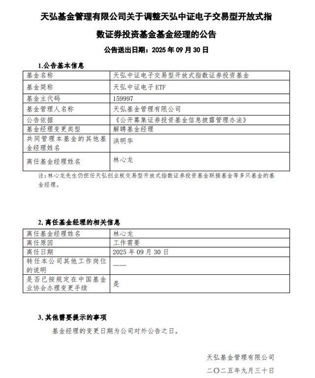 9月30日,天弘中证电子ETF(159997)公告称,基金经理林心龙不再管理天弘中证电子ETF,离任原因:工作需要,由共同管理基金经理洪明华管理该基金。变更日期为2025年9月30日。