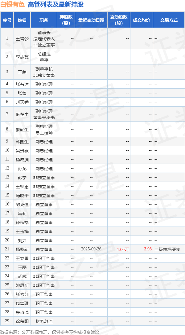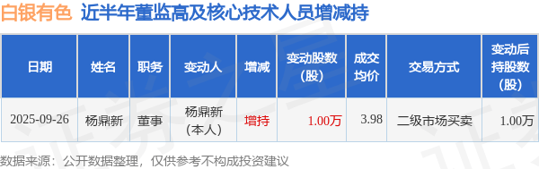 证券之星消息,根据9月30日市场公开信息、上市公司公告及交易所披露数据整理,白银有色(601212)最新董监高及相关人员股份变动情况:2025年9月26日公司董事杨鼎新共增持公司股份1.0万股,占公司总股本为0.0001%。变动期间公司股价上涨3.46%,9月26日当日收盘报3.89元。