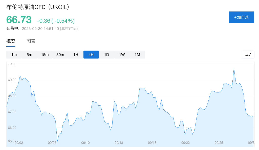 - 布伦特原油下跌0.5至66.73美元/桶。