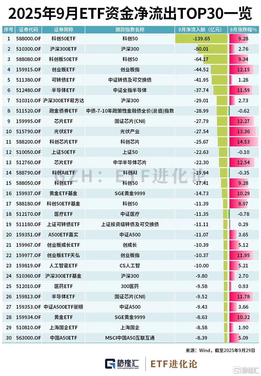 而科创50ETF、沪深300ETF、科创板50ETF、创业板ETF在9月分别净流出139.65亿元、80.01亿元、64.17亿元、44.52亿元