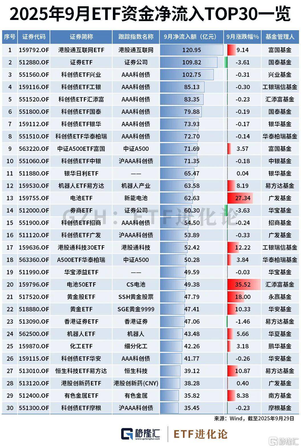 从ETF产品角度来看,9月最受资金青睐的ETF是:港股通互联网ETF、证券ETF、科创债ETF兴业,分别净流入120.95亿元、109.82亿元、102.75亿元。