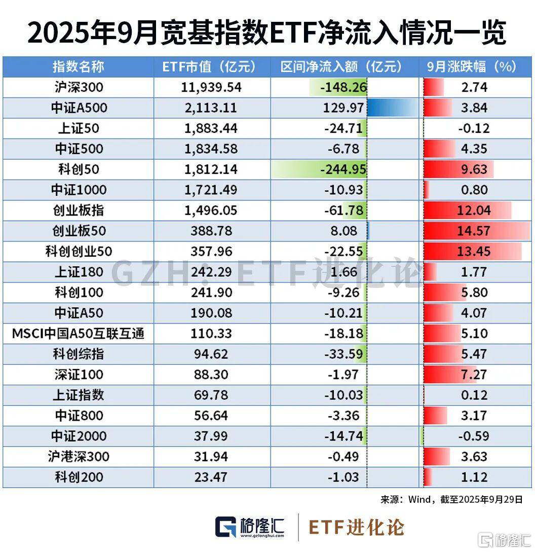 从宽基指数角度来看,科创50、沪深300指数“失血”居前,分别净流出244.95亿元和138.26亿元,中证A500成为唯一净流入的宽基指数,9月净流入132.01亿元。