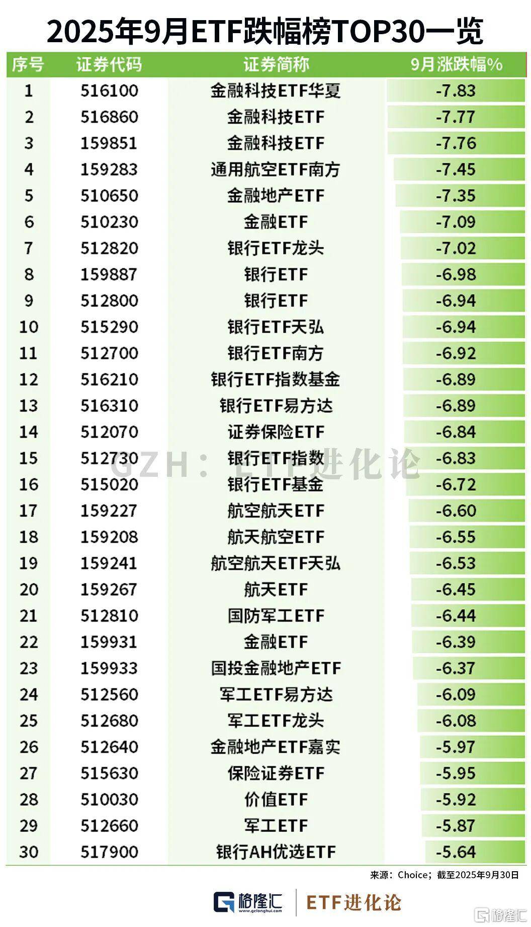 金融、军工主题ETF则整整萎靡了一个月,直到节前两日才有所反弹。金融科技ETF华夏、金融科技ETF、通用航空ETF南方、金融地产ETF在9月均跌逾7%。