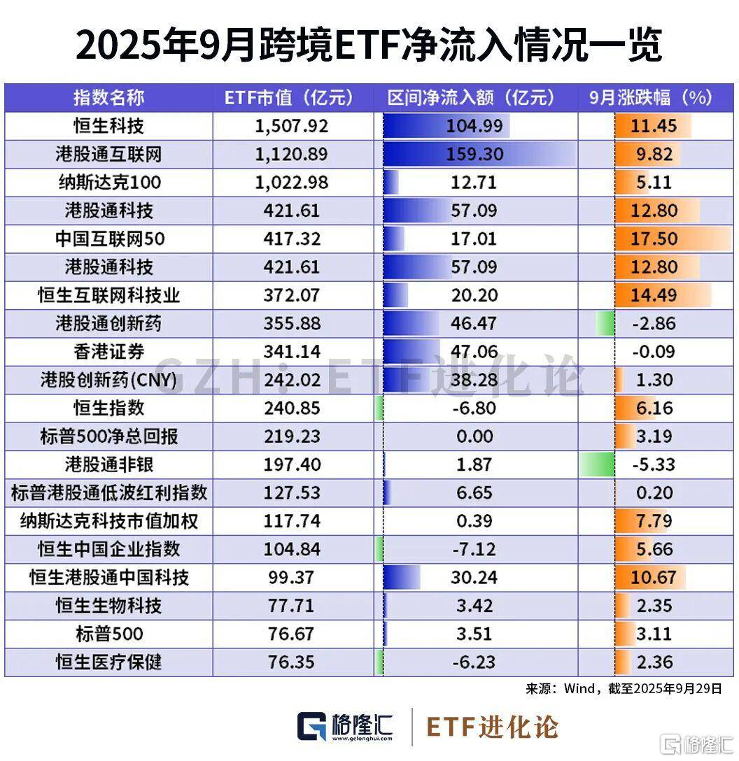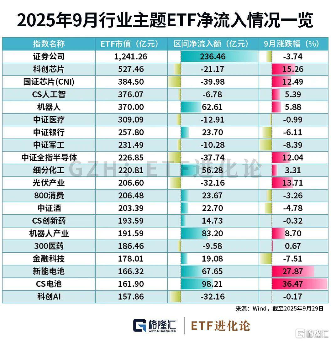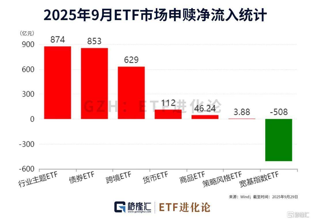 截至9月29日,ETF全市场9月净流入2010亿元,其中837亿元净流入行业主题ETF、853亿元净流入债券ETF、629亿元涌入跨境ETF。