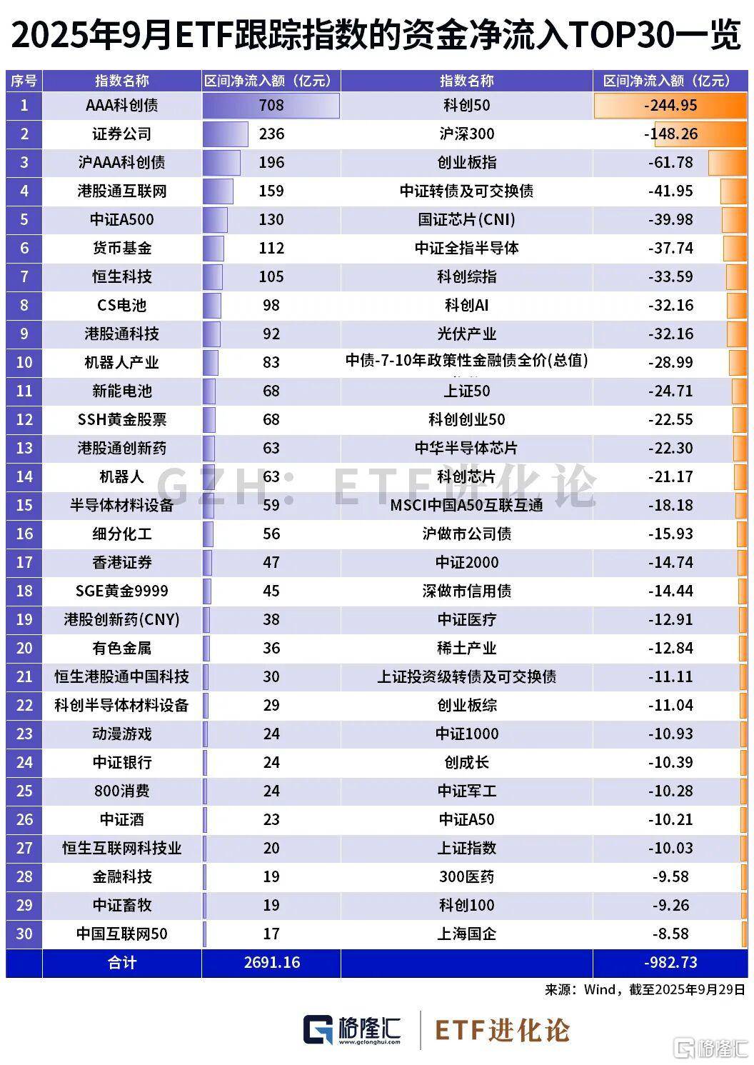从全市场的指数角度来看,AAA科创债、证券公司、沪AAA科创债、港股通互联网、中证A500在9月“吸金”居前,分别净流入708亿元、236亿元、196亿元、159亿元、130亿元。