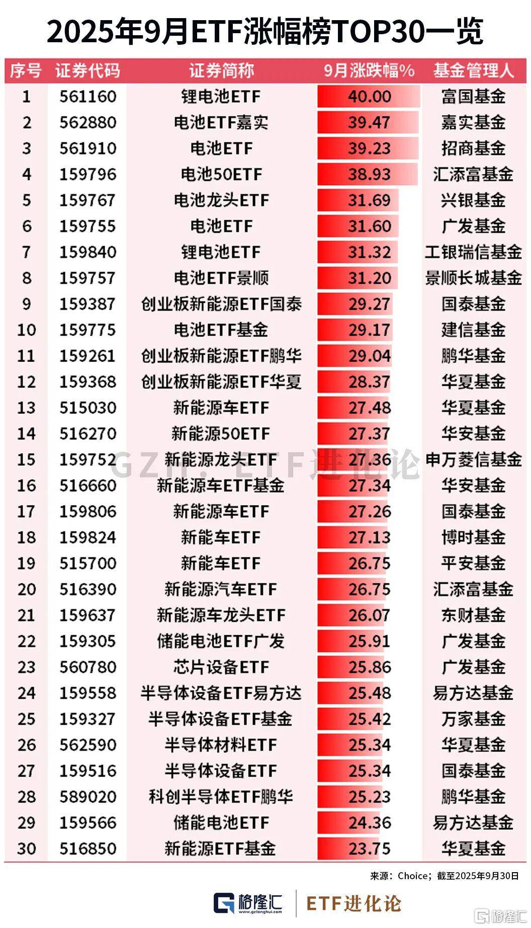 9月,新能源、半导体主题ETF霸屏涨幅榜,锂电池ETF、电池ETF嘉实、电池ETF涨超30%,芯片设备ETF、半导体设备ETF易方达涨超25%。