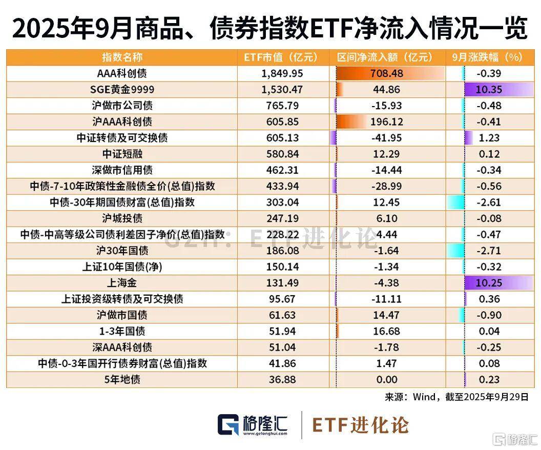 从商品、债券指数角度来看,AAA科创债、沪AAA科创债、SGE黄金9999在9月分别净流入708.48亿元、196.12亿元、44.86亿元。