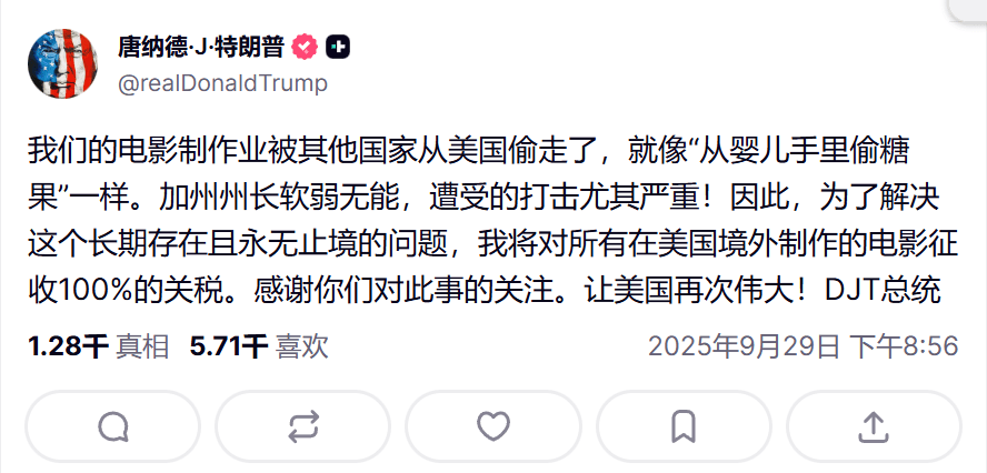 美国总统特朗普9月29日在社交平台发帖称,“我将对所有在美国以外制作的电影征收100%的关税。”