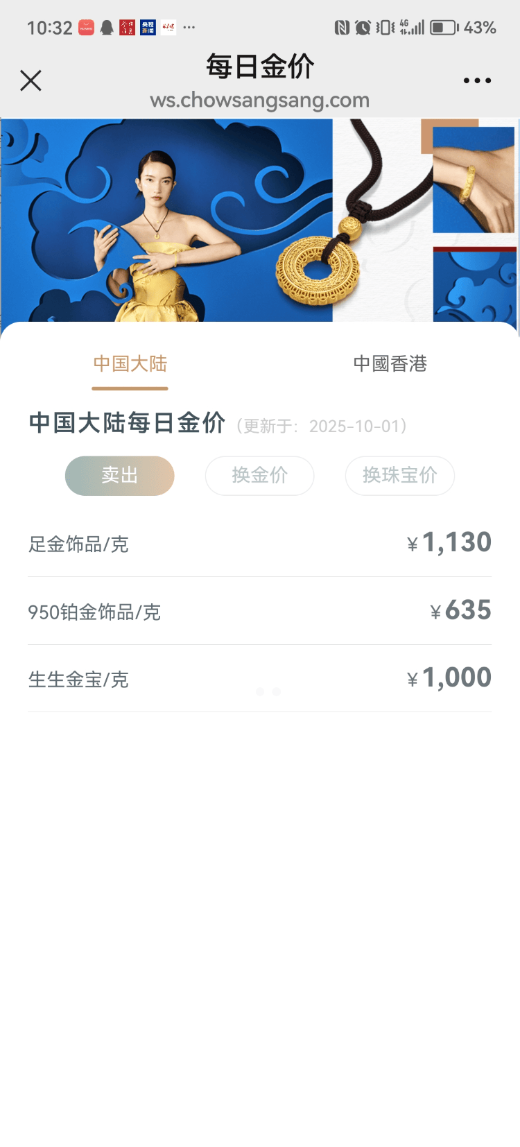 国内金饰价格方面,10月1日,上游新闻记者查询发现,周生生足金饰品标价1130元/克,老凤祥足金饰品标价1125元/克,周大福足金饰品标价1129元/克。