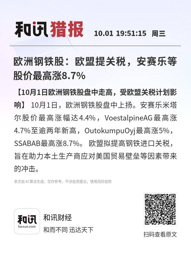 【10月1日欧洲钢铁股盘中走高,受欧盟关税计划影响】10月1日,欧洲钢铁股盘中上扬。安赛乐米塔尔股价最高涨幅达4.4%,VoestalpineAG最高涨4.7%至逾两年新高,OutokumpuOyj最高涨5%,SSABAB最高涨8.7%。欧盟拟提高钢铁进口关税,旨在助力本土生产商应对美国贸易壁垒等因素带来的冲击。