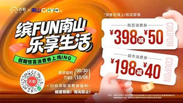 • 综合消费领域,“南山CityGo”系列消费券活动同步上线,发放总额超5000万元的消费券,联动淘宝闪购、京东、抖音等线上平台,支持天虹、盒马、京东MALL、深圳湾万象城二期等线下商业体,通过“线上+线下”模式,覆盖餐饮、3C数码、家用电器、日用百货等多个消费场景发放消费券,全方位满足市民多样化需求,助力本土品牌发展。