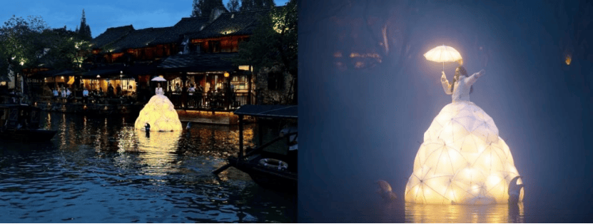 来自荷兰的女歌唱家将身着巨大伞状礼服,漂浮于海面,用经典歌剧咏叹调的形式向观众演绎中国经典曲目。歌唱家的造型灵感来自17世纪的欧洲古典服装和荷兰的水乡风貌,与东方的海滨自然景观和人文环境交相辉映,打造富有诗意的“海上奇观”和中西艺术对话,唤起观众中秋氛围下“天涯共此时”的情感体验。