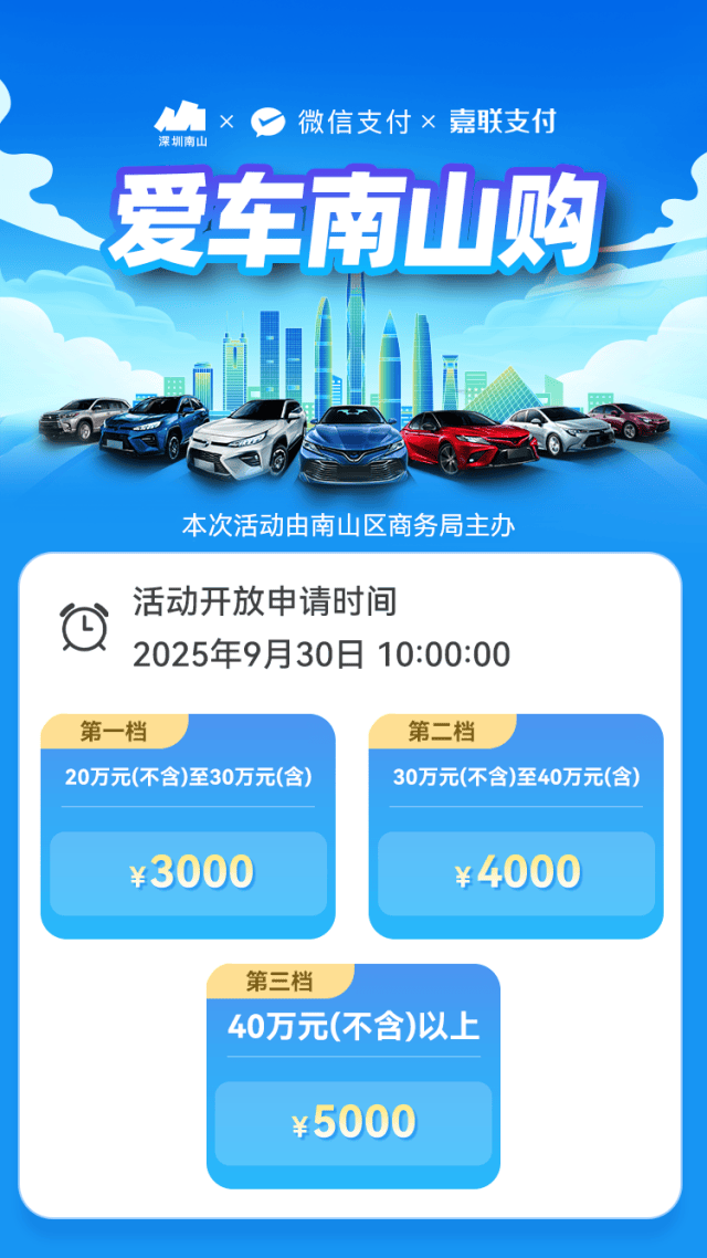 • 汽车消费领域,南山区启动“爱车南山购”之“Chill日好车节”购车补贴活动,3000万元真金白银为消费者送上最直接、最实在的优惠;