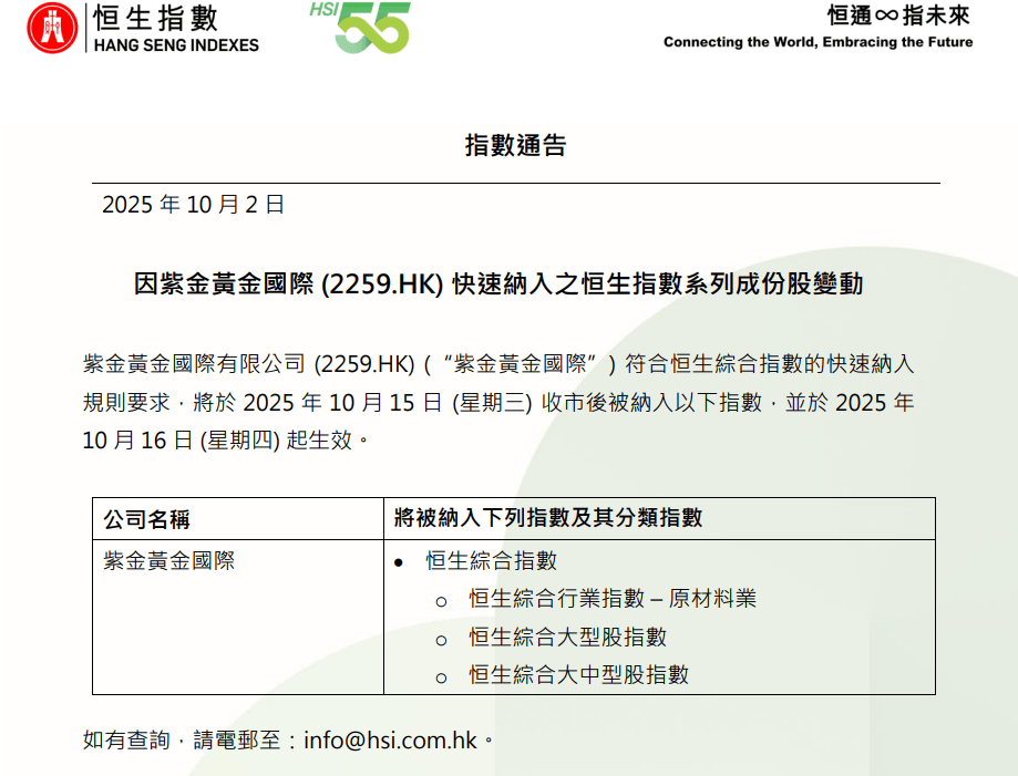 【大河财立方消息】10月2日,恒生指数公司发布公告:紫金黄金国际有限公司(2259.HK)(“紫金黄金国际”)符合恒生综合指数的快速纳入规则要求,将于2025年10月15日(星期三)收市后被纳入以下指数,并于2025年10月16日(星期四)起生效。