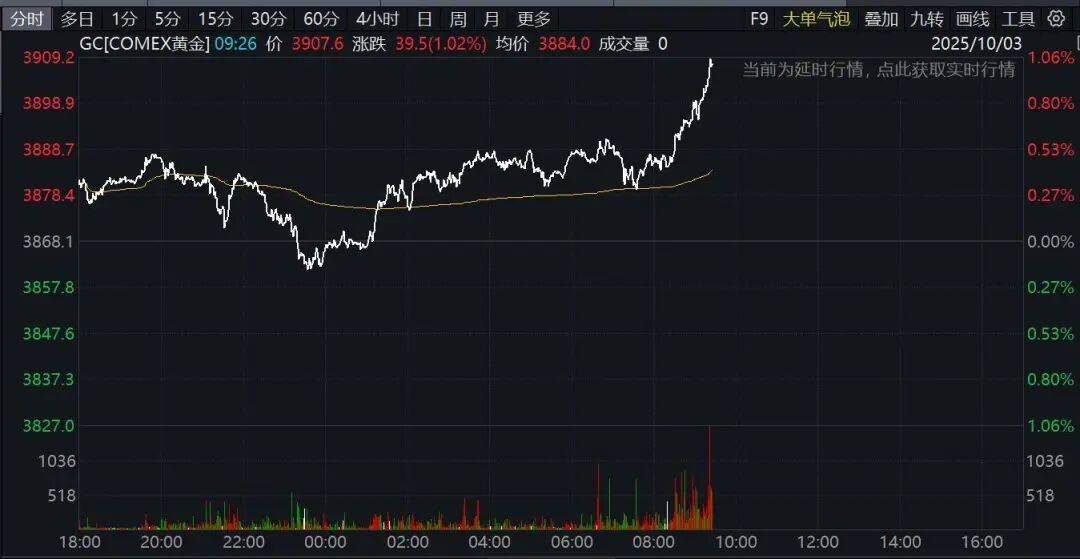 国际金价拉升,COMEX黄金期货涨幅扩大至超1%,站上3900美元/盎司。