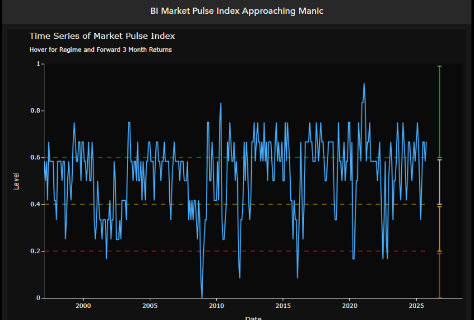 在这个每四天就刷新一次纪录的市场中,华尔街似乎忙于追逐上涨行情,无暇顾及政府停摆和估值过高这类风险。巴克莱编制的情绪指标持续徘徊在反映市场过度乐观的水平附近。彭博行业研究一项类似指标已重返“狂热”区域,而该区域在历史上往往预示着后续回报平平。