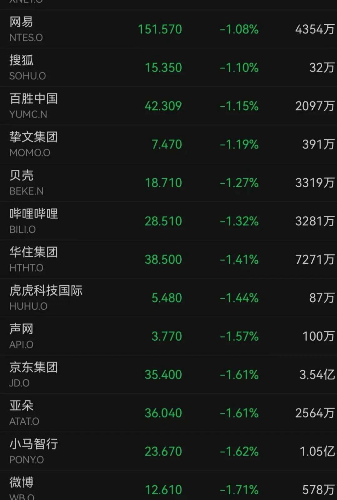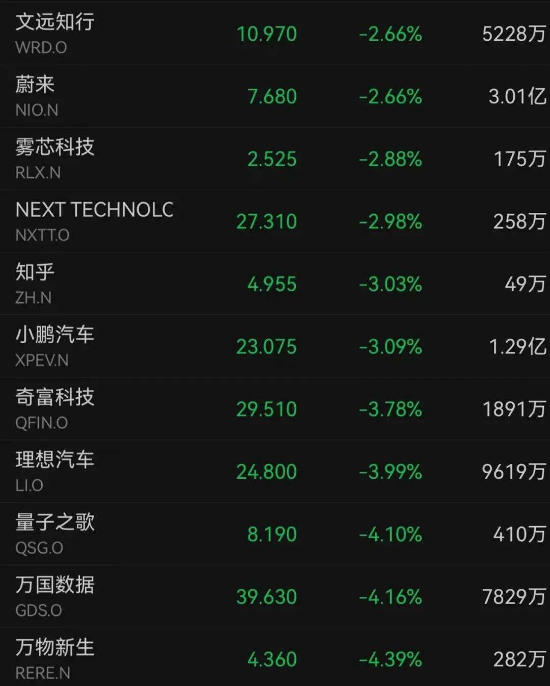 蔚来、小鹏汽车、理想汽车分别下跌2.66%3.09%3.99%。文远知行、网易、哔哩哔哩等分别下跌2.661.08%1.32%