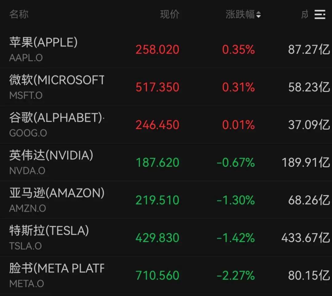 截至收盘,英伟达下跌0.67%,亚马逊、特斯拉和脸书分别下跌1.30%1.42%2.27%。苹果、微软和谷歌分别收涨0.35%0.31%0.01%