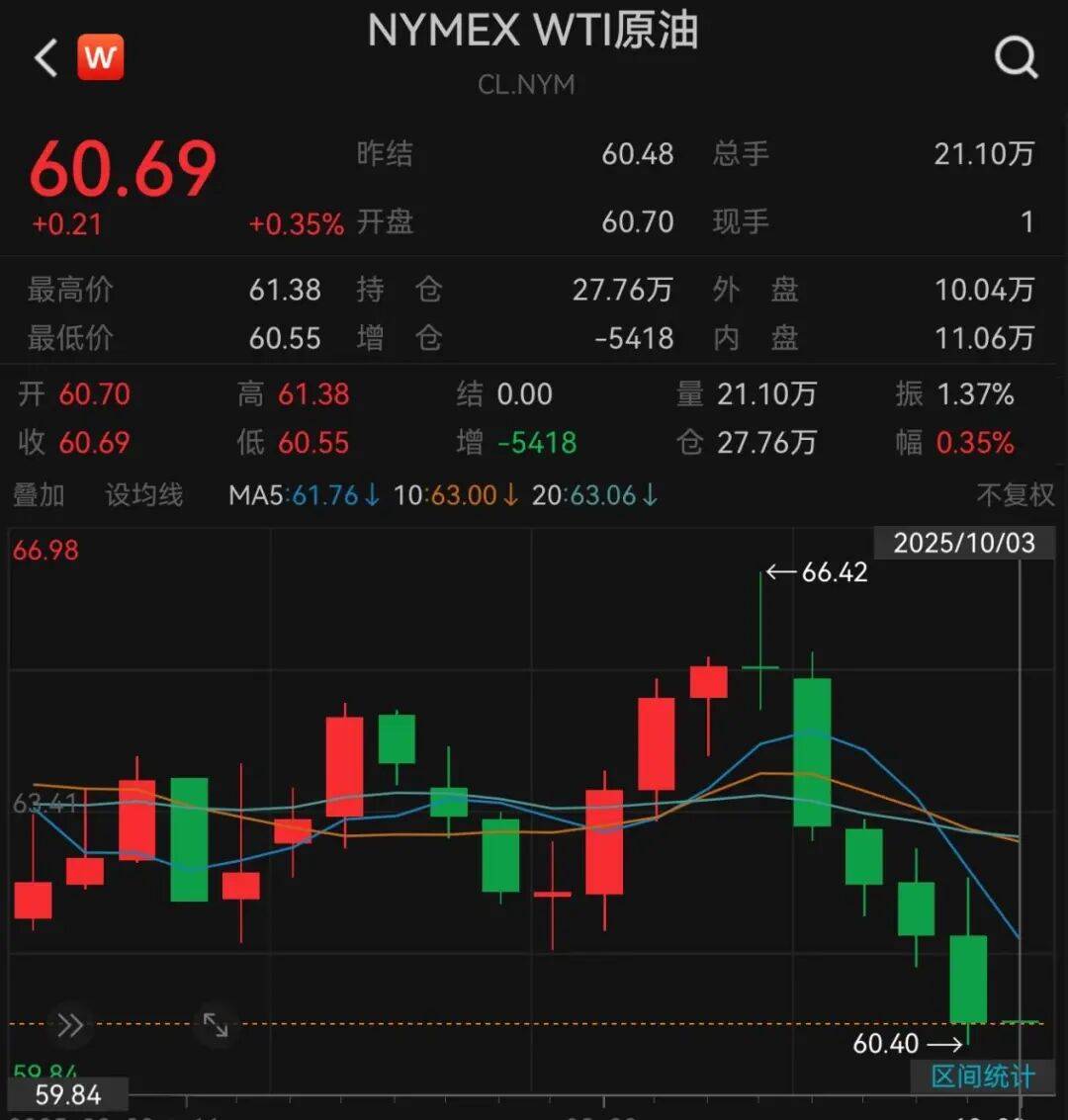 国际油价小幅收涨,结束连跌。周五,NYMEX WTI原油上涨0.35%
