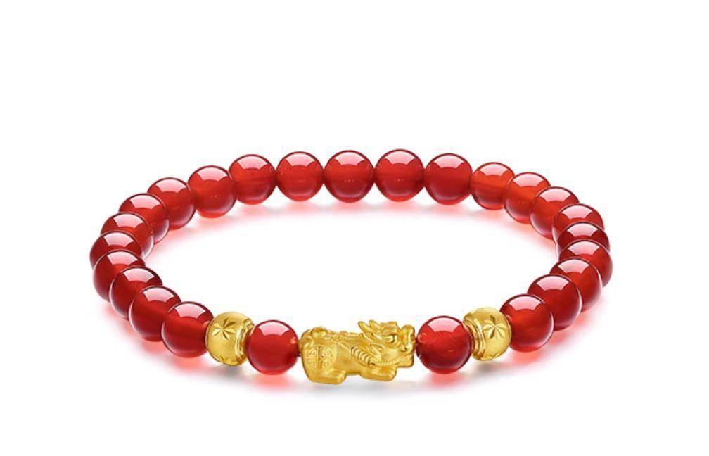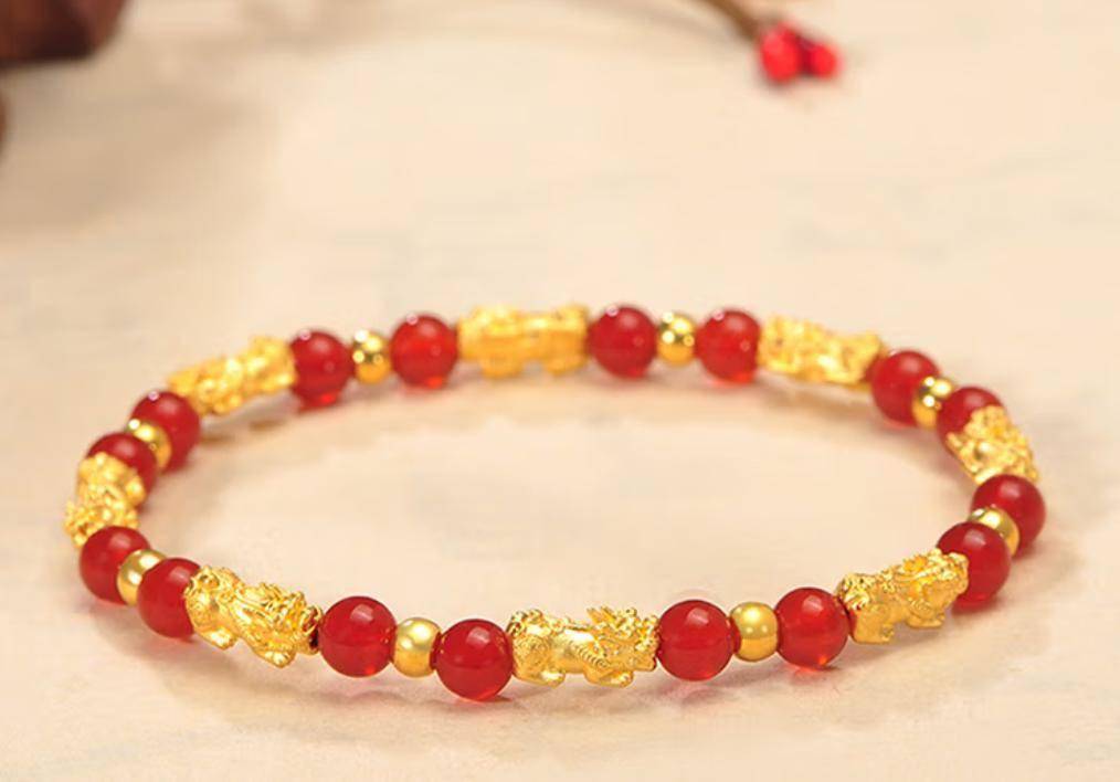 设计上,这款手串以貔貅造型的黄金转运珠为主体,周围搭配优质红玛瑙珠子。貔貅是中国传统文化中的招财神兽,寓意吸财纳福、辟邪化煞;而红玛瑙则象征着活力、勇气和信心,两者结合相得益彰。