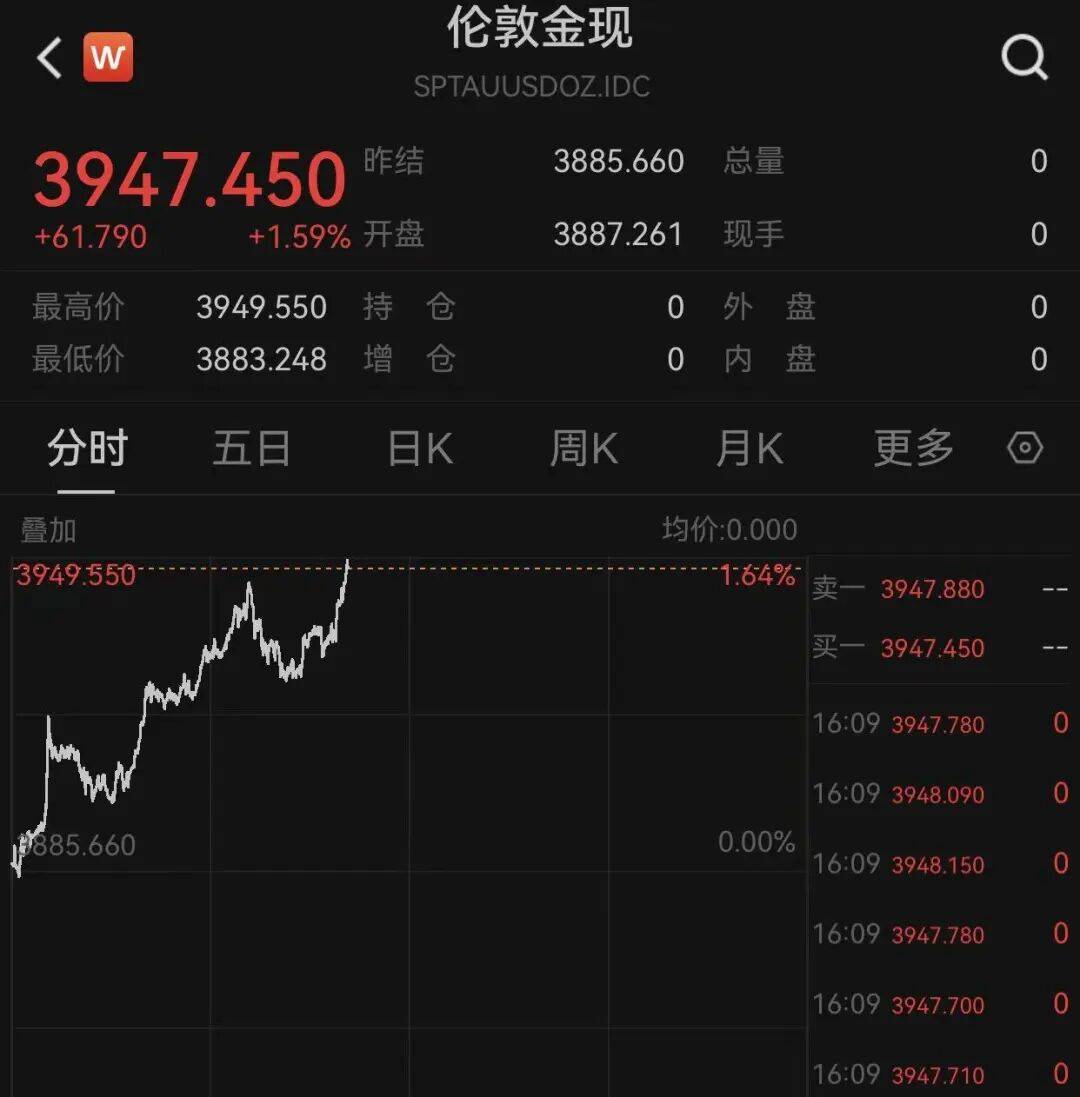 而黄金则再度直线狂飙,截至发稿,现货黄金暴涨近1.6%,冲击3950美元/盎司。
