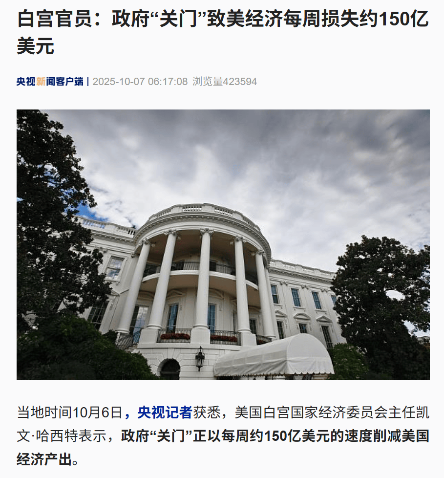 当地时间10月6日,央视记者获悉,美国白宫国家经济委员会主任凯文·哈西特表示,政府“关门”正以每周约150亿美元的速度削减美国经济产出。