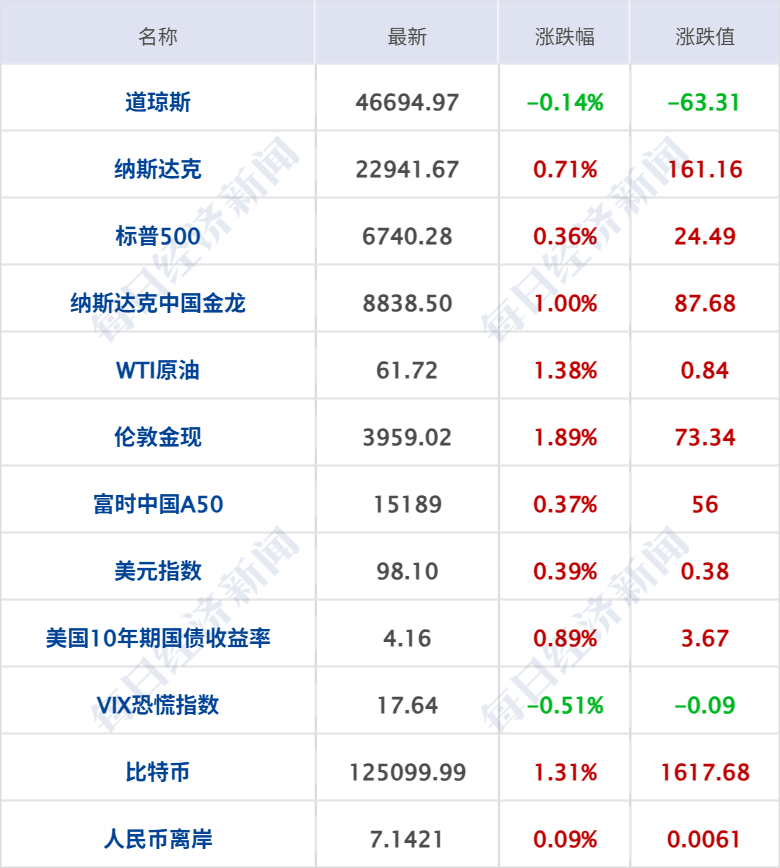 美股三大指数收盘涨跌不一,道指跌0.14%,纳指涨0.71%,标普500指数涨0.36%,其中,纳指、标普500指数创收盘新高;大型科技股多数上涨,特斯拉涨超5%,微软、谷歌涨超2%,英伟达跌超1%。AMD盘中一度涨37.6%,最终收涨23.71%,AMD与OpenAI签订芯片供应协议。加密货币、贵金属板块涨幅居前,Bitfarms涨近15%,赫克拉矿业涨超4%,泛美白银涨超2%,Circle、Coinbase涨超1%。纳斯达克中国金龙指数涨1%,中概股多数上涨,小牛电动涨超23%,小鹏汽车、百度涨超2%,知乎、京东、名创优品涨超1%,蔚来跌超1%。