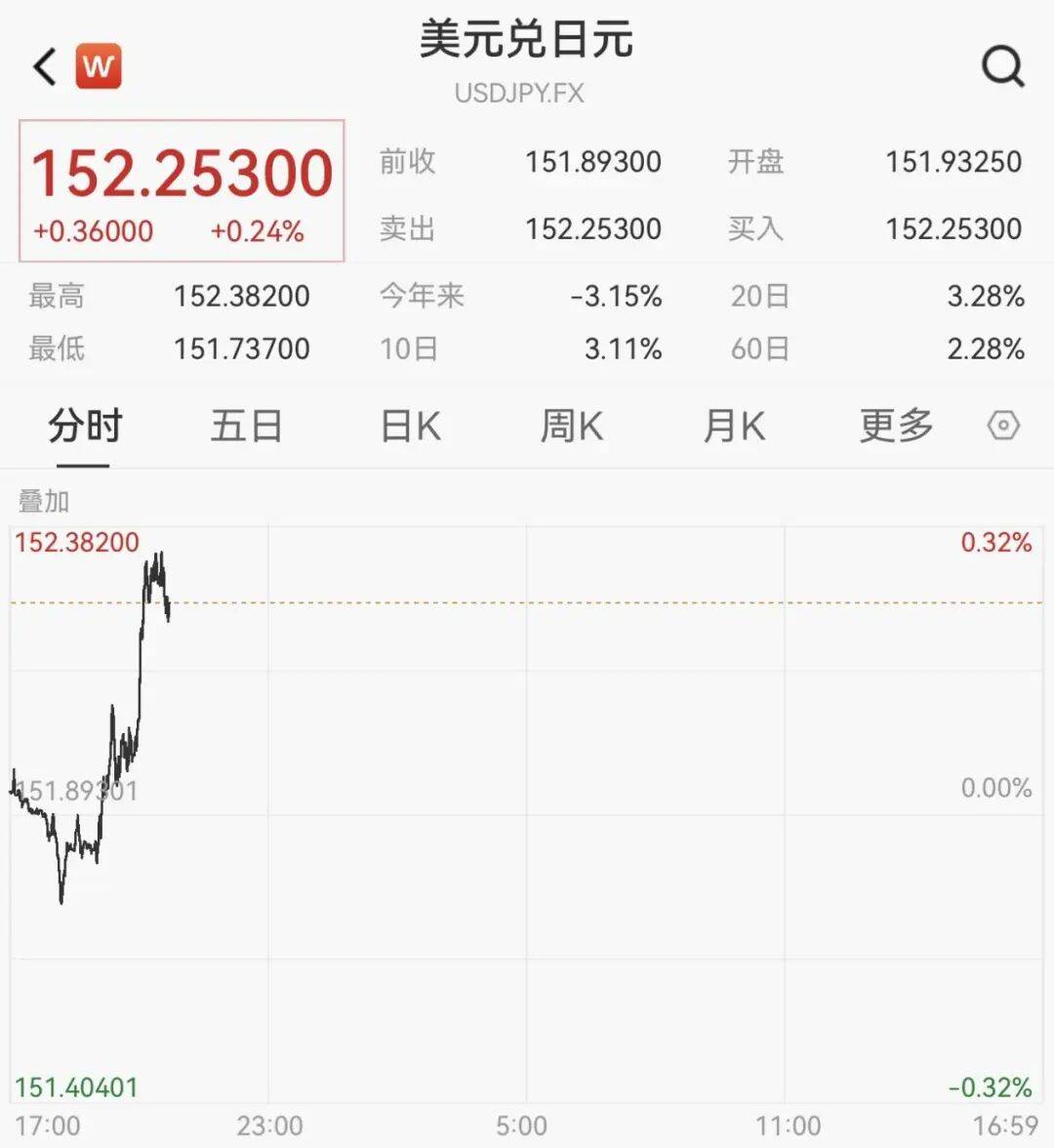 美元兑日元汇率升至152.25日元,为2月19日以来的最高水平。