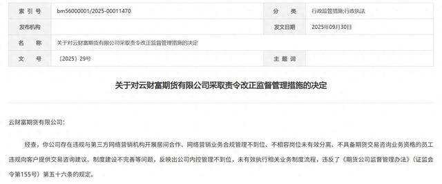近日,新疆证监局发布的行政监管措施公告显示,云财富期货有限公司被责令改正。