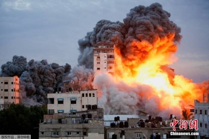 图为当地时间10月7日,在以色列军队袭击加沙城内一座高楼后,现场火光冲天浓烟滚滚。