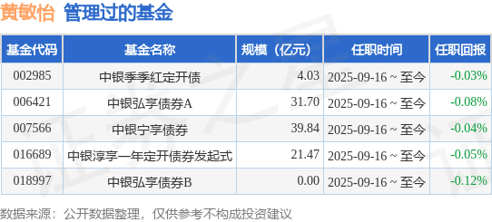黄敏怡先生:中国国籍,中银基金管理有限公司高级副总裁(SVP),金融学硕士。曾任华一银行资金部高级交易员、投资主管,美银美林环球金融市场部利率交易员、经理,汇添富基金基金经理助理。2012年加入中银基金管理有限公司,曾任专户投资经理。2025年9月至今任中银弘享基金基金经理,2025年9月至今任中银季季红基金基金经理,2025年9月至今任中银淳享基金基金经理,2025年9月至今任中银宁享基金基金经理。注册金融分析师(CFA)。