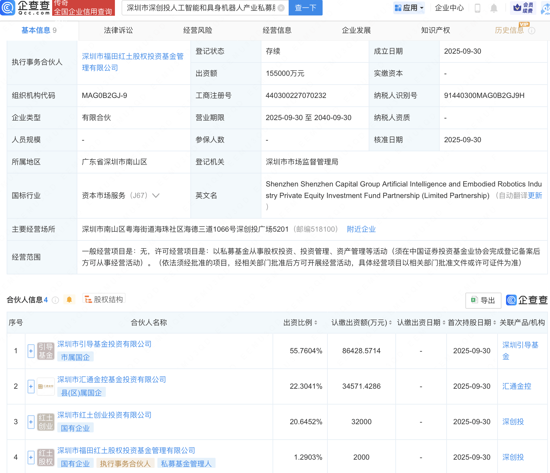 企查查APP显示,近日,深圳市深创投人工智能和具身机器人产业私募股权投资基金合伙企业(有限合伙)成立,出资额15.5亿元,经营范围包含:以私募基金从事股权投资、投资管理、资产管理等活动。企查查股权穿透显示,该企业由深圳市引导基金投资有限公司等共同出资。