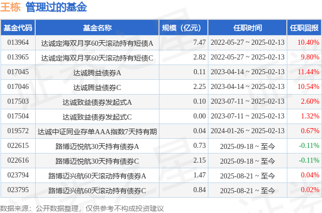 王栋先生:中国国籍,浙江大学会计学财务管理硕士。自2007年7月至2025年2月,其先后于中国民生银行深圳分行担任金融同业部业务经理;平安银行股份有限公司担任固定收益部投资经理;平安理财有限责任公司担任固定收益部投资经理;达诚基金管理有限公司担任固定收益部部门总监、基金经理。2025年2月加入路博迈基金管理(中国)有限公司,现任公募固收投资部联席总经理、基金经理。2025年08月21日起任路博迈兴航60天滚动持有债券型证券投资基金基金经理。2025年9月18日担任路博迈悦航30天持有期债券型证券投资基金基金经理。