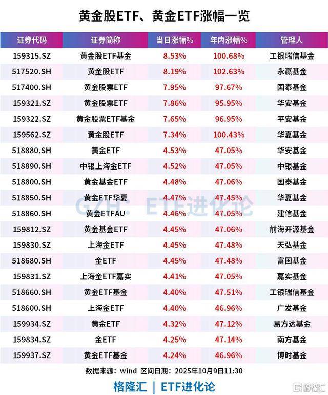 今日A股开盘,截至上午收盘,黄金股ETF基金、黄金股ETF涨超8%;黄金股票ETF、黄金股票ETF、黄金股票ETF基金、黄金股ETF涨超7%;黄金ETF、中银上海金ETF、黄金基金ETF、黄金ETF华夏、黄金ETFAU、黄金基金ETF、上海金ETF、金ETF、上海金ETF嘉实、黄金ETF基金、上海金ETF、黄金ETF、金ETF、黄金ETF基金涨超4%。