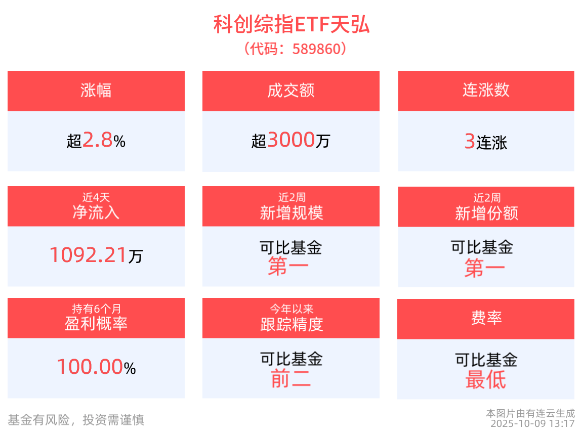 资金流入方面,科创综指ETF天弘(589860)最新资金净流入2163.26万元。拉长时间看,近4个交易日内,合计“吸金”1092.21万元。