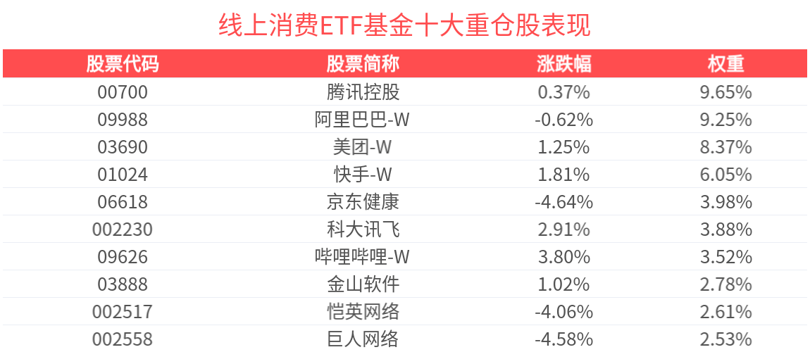 数据显示,截至2025年9月30日,中证沪港深线上消费主题指数(931481)前十大权重股分别为阿里巴巴-W(09988)、腾讯控股(00700)、快手-W(01024)、美团-W(03690)、京东健康(06618)、巨人网络(002558)、哔哩哔哩-W(09626)、科大讯飞(002230)、恺英网络(002517)、昆仑万维(300418),前十大权重股合计占比55.76%。
